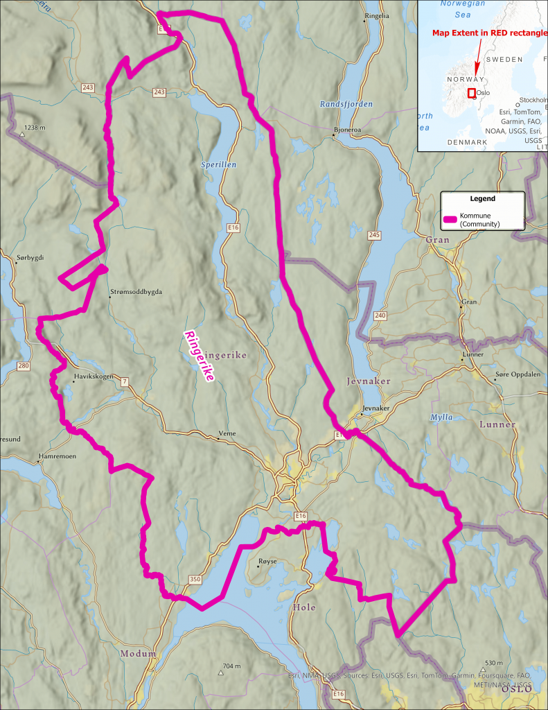 Ringerike is rich in history, an ancient kingdom that historically was associated with the current-day kommuner of Hole, Krødsherad, Modum and Sigdal.  The administrative center is Hønefoss.  The circle on the shield represents the unity of the district. Ringerike is a rich agricultural area.